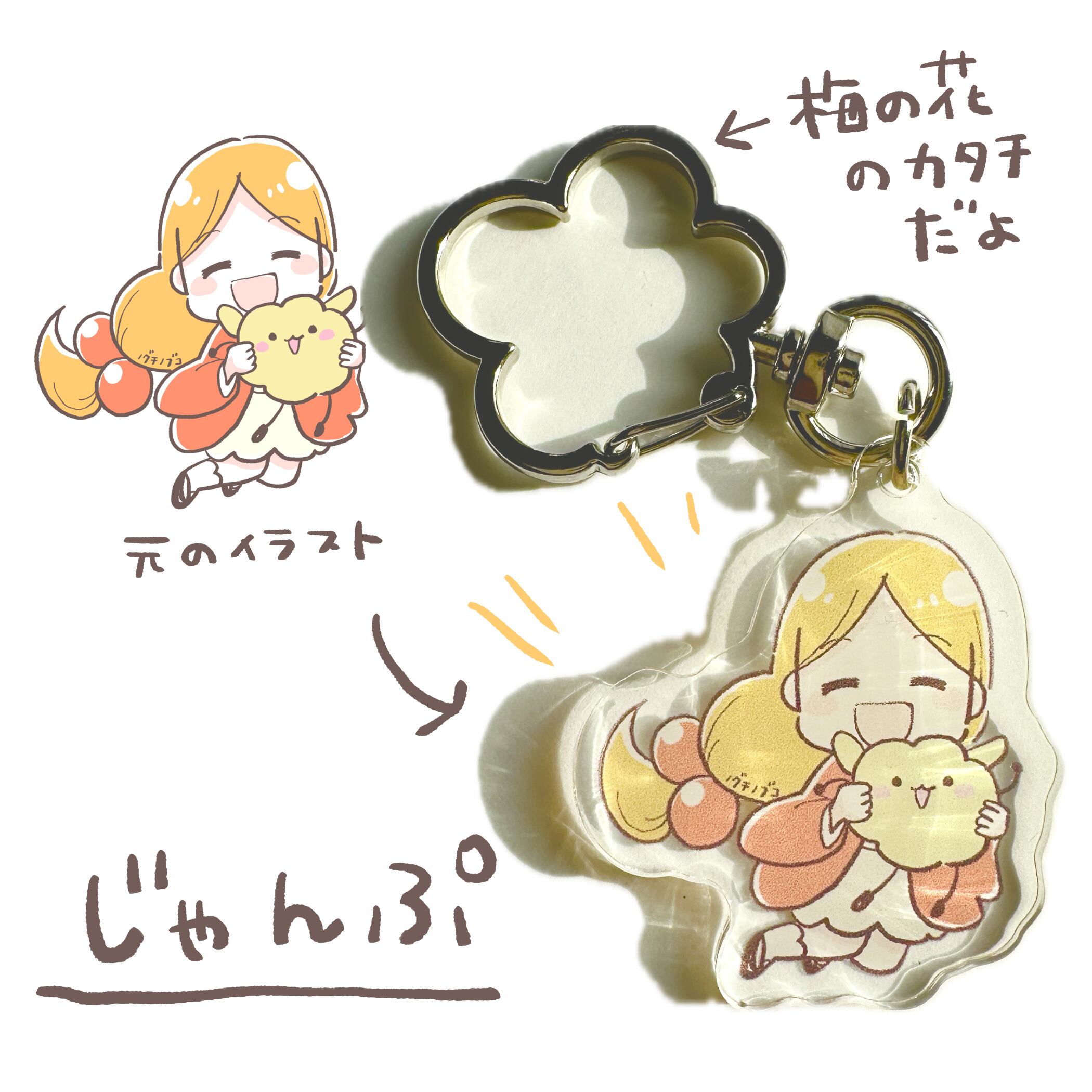 髪の色は本みりんの黄金色、羽織の朱色は経年したみりんがメイラード反応により赤みを増した時の色をイメージしています。みりんちゃんといつも一緒にいるお供のモコモコは「こぼれ梅」。こぼれ梅とは、みりんを搾った時にできる「みりん粕」の別称。江戸時代の人がみりん粕を見た時、散りこぼれた梅の花に似ている!と名付けたそうです。